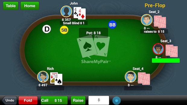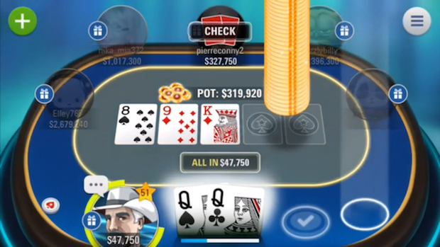 در حالی که اپلیکیشن پوکر دارای دکمه های معمولی برای چک/شرط/فولد است، همچنین دارای ژست های لمسی برای هر یک از دکمه های بازی پوکر است. دوبار ضربه زدن به معنای چک/کال است. Flick up به معنای فولد است و در نهایت با نگه داشتن و به آرامی کشیدن به بالا، فولد صورت میگیرد.