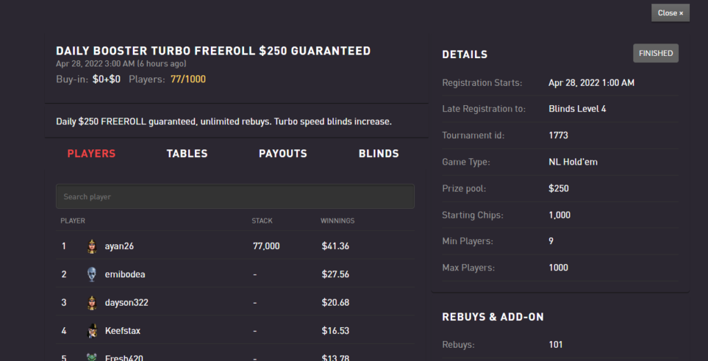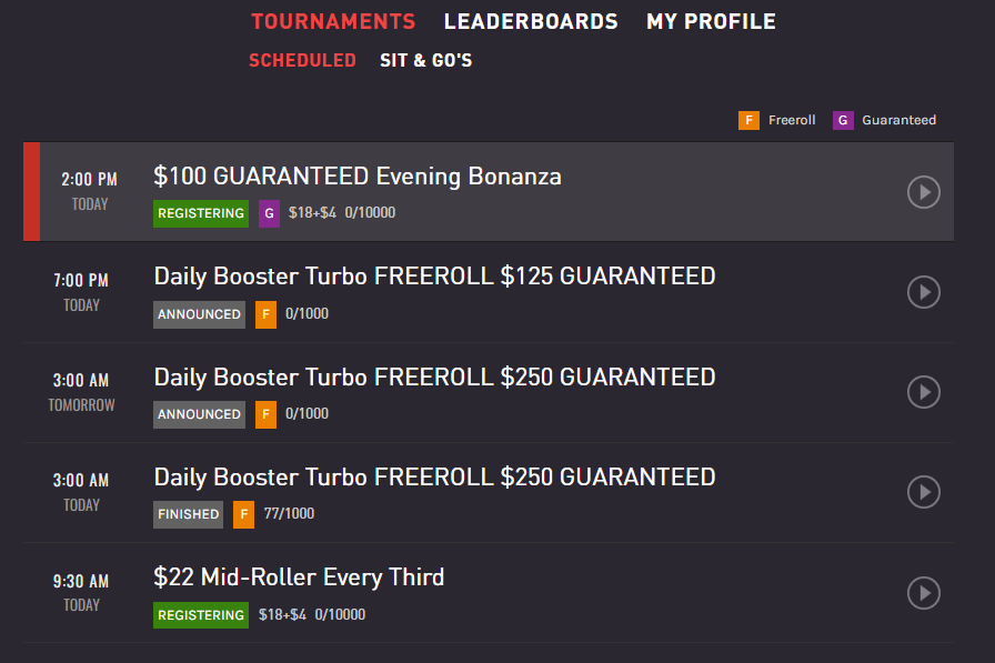 این اپراتور هر یکشنبه فریولهای روزانه را با 125 دلار و 250 دلار تضمین شده با 500 دلار فریول اجرا می کند. از آنجایی که مشتری پوکر آنها هنوز در مرحله اولیه است، این تورنمنتها زیاد مورد بازدید قرار نمیگیرند و ارزش زیادی دارند.